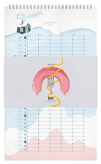 Den stora kalendern är fäst med en mässingsklämma på en ljusgrå spånskiva. Klämman har hål i toppen så att den enkelt kan fästas på väggen. Kalendern har en avtagbar pappersgördel med beskrivande text och streckkod. Den mindre varianten har sprial....