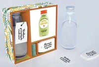 Presentboxen innehållande en flaska, etiketter, band och en miniversion av den populära boken Gröna smoothies är den bästa gå bort-present man kan tänka sig till alla som gillar en god smoothie!.